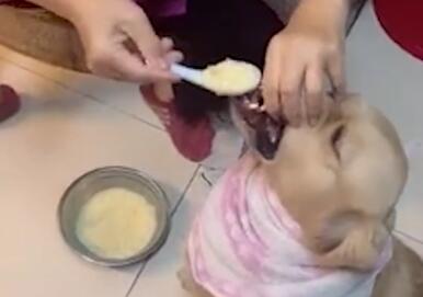 老奶奶灌饭式给狗狗喂食 主人:和小朋友一样,硬要掰才吃
