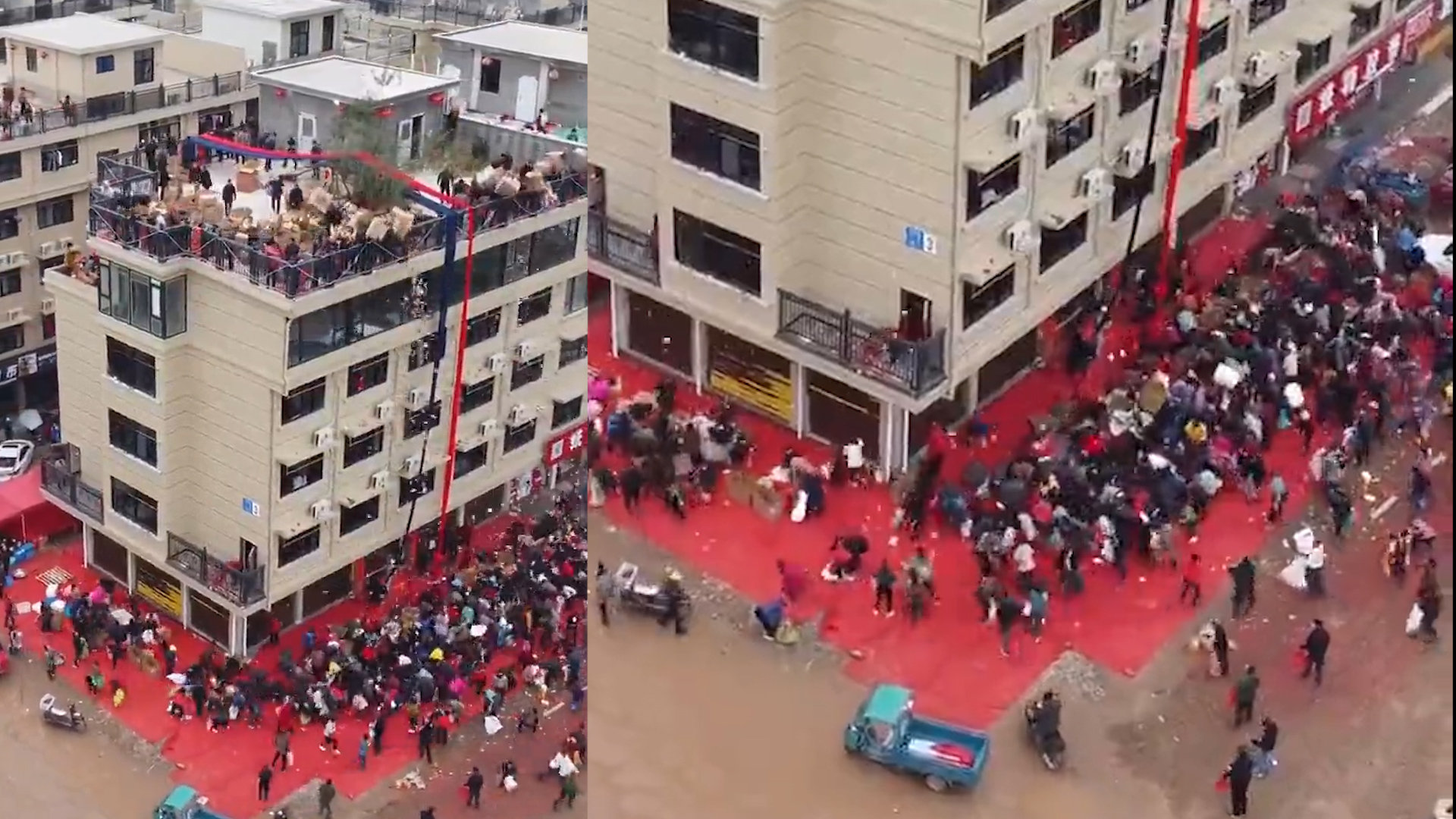 房主庆祝乔迁顶楼倾倒几十箱礼物 上百人哄抢