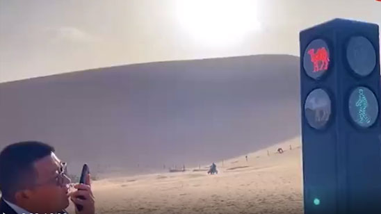 敦煌鸣沙山景区设骆驼红绿灯:骆驼绿灯骆驼走,人绿灯人走