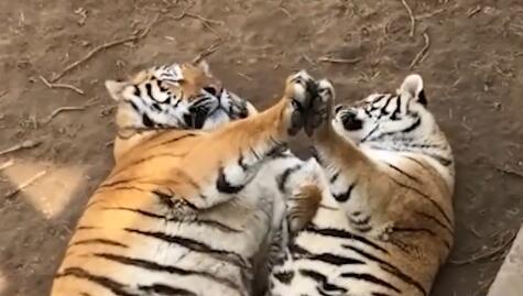 被酸到了吗?动物园两只胖虎面对面合掌秀恩爱