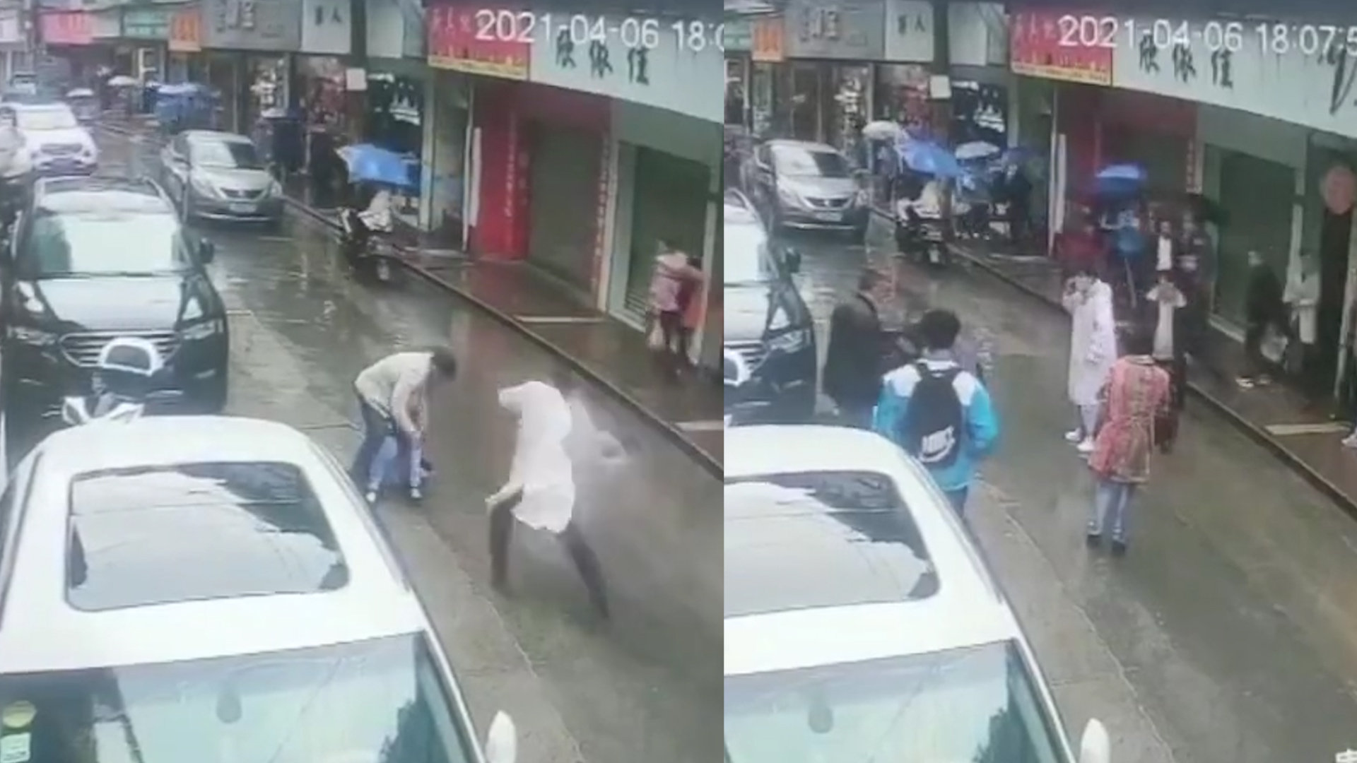 男子持刀当街把女孩按倒在地 白褂医生飞身一棒 众人齐制服