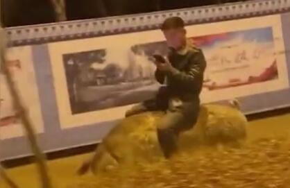 路人惊呆 男子半夜街头骑着猪玩手机