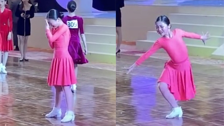 小女孩摔得很疼哭了 但依然跳完最后一支舞蹈!
