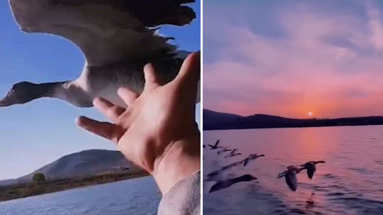 太梦幻了!大雁跟随快艇飞行不时变换队形 游客伸手即可触及大雁