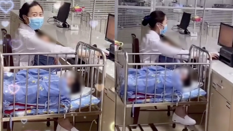最美天使!95后护士手脚并用 边工作边哄俩宝宝