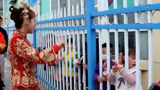 新娘老师结婚专程给孩子送糖 还隔栏互动歌舞道别场面令人动容