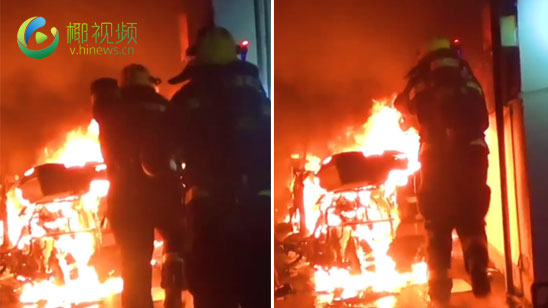 楼道内电动车猛烈燃烧 消防员冲入火海救人!