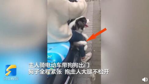 “主人骑慢点,狗子害怕!”狗狗坐电动车紧张,紧抱主人大腿不松脚