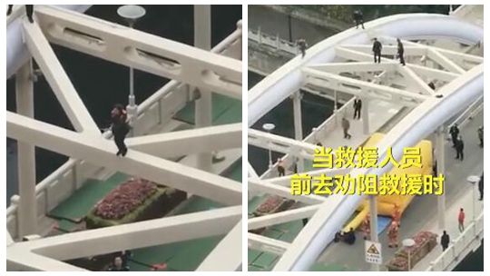 神操作!大妈在钢架桥上如履平地翩翩起舞 还躲过了救援人员的“围追堵截”