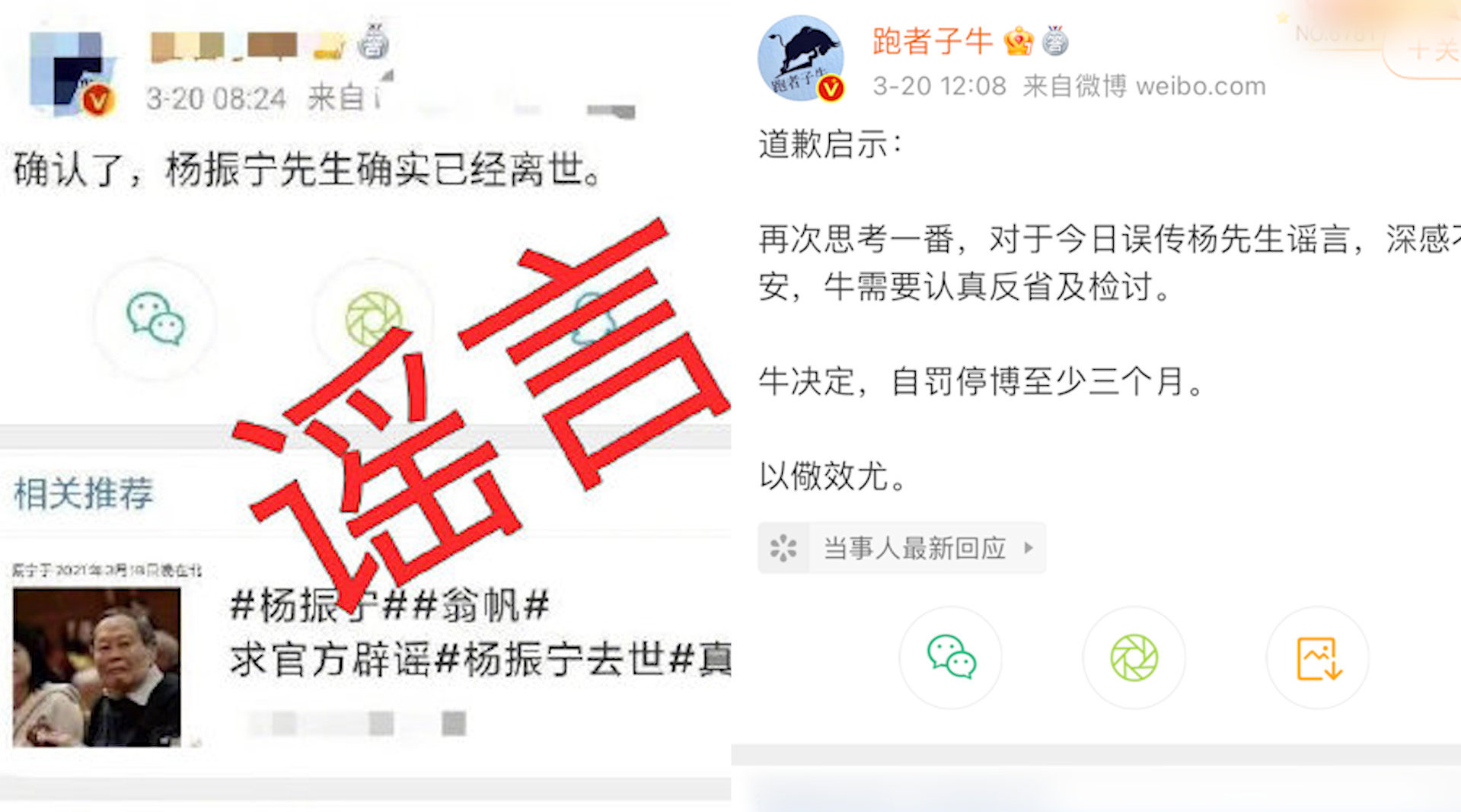 造谣杨振宁去世假消息博主道歉:自罚停博至少3个月