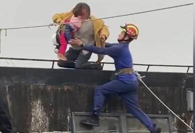 惊险!消防员飞身扑救抱婴儿轻生女子