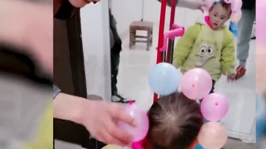 爸爸吹气球给2岁女儿做头饰孩子照镜子满脸问号 网友直呼可爱