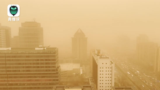 实拍沙尘暴袭击北京城:天空昏黄一片,汽车缓慢行驶