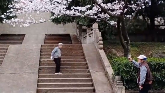 老爷爷樱花树下给老伴拍照 网友:我也想要这样的爱情