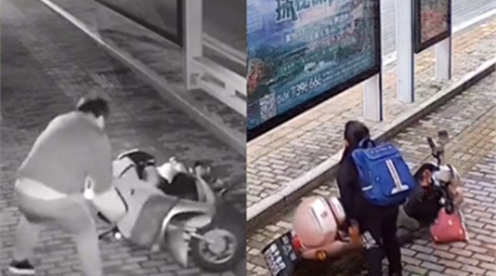 鲜明对比!醉汉深夜莫名打砸电动车 小学生扶起被拽倒在地电动车