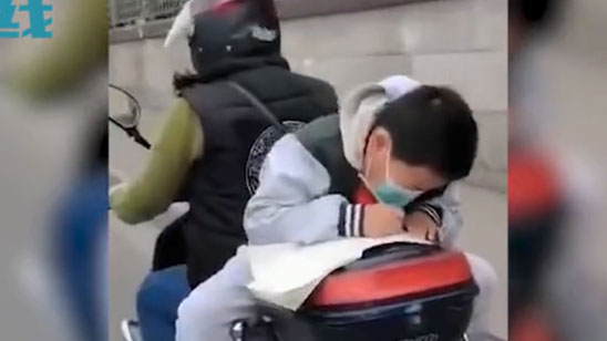 赶工期!一小学生不戴头盔倒坐摩托车 后背箱当课桌专注写作业