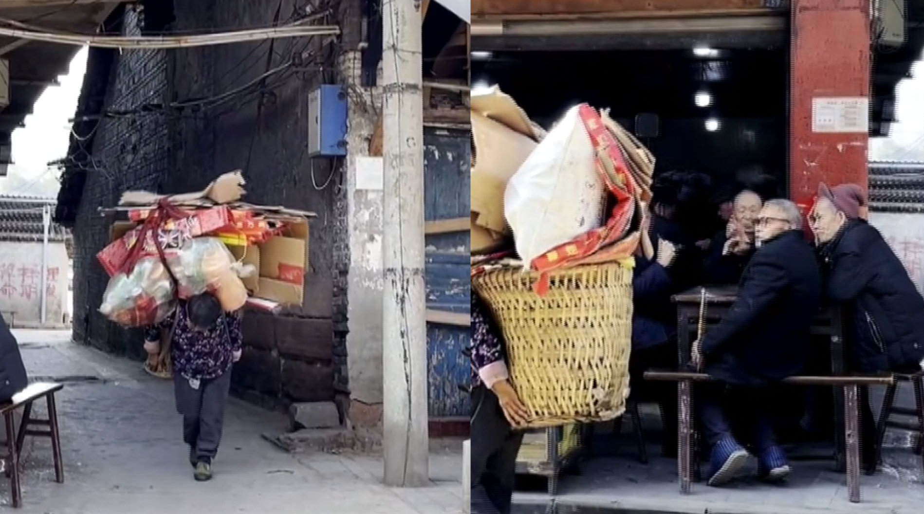 老奶奶背一大摞纸箱走过,与巷口闲聊老爷爷对视的瞬间,让人心酸