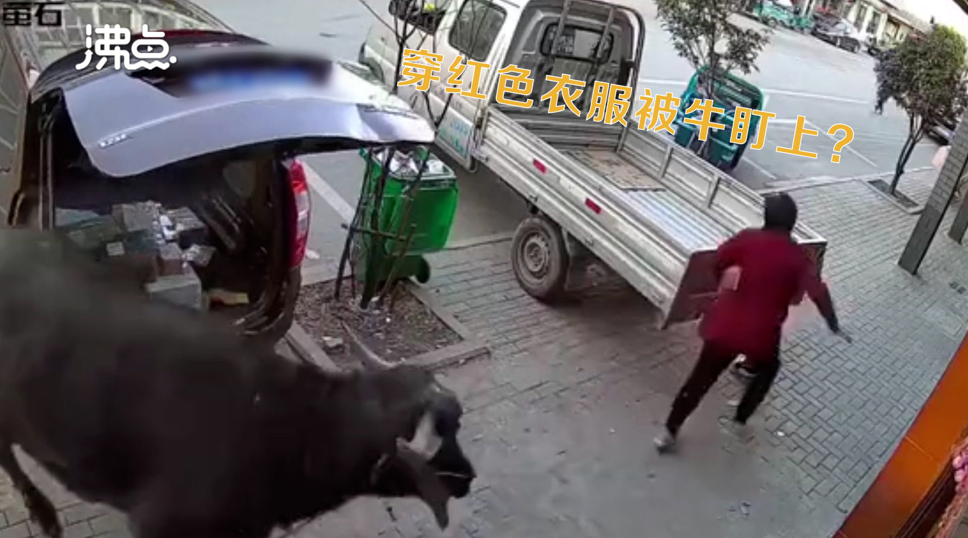 大妈穿红衣上街遭老牛追赶 机智掉头躲过一劫