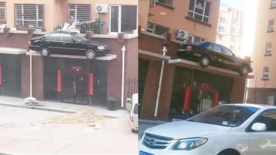 就想知道它咋上去的?汽车“停放”居民楼房檐上……