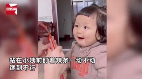 1岁萌妹子看小姨吃辣条馋出表情包 下一秒直接上手抢走