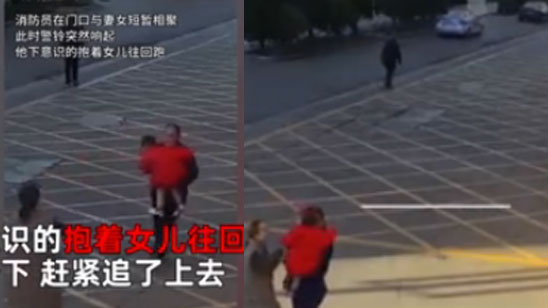 心酸!妻子带女儿看望消防员丈夫 警铃突响爸爸抱娃拔腿就跑