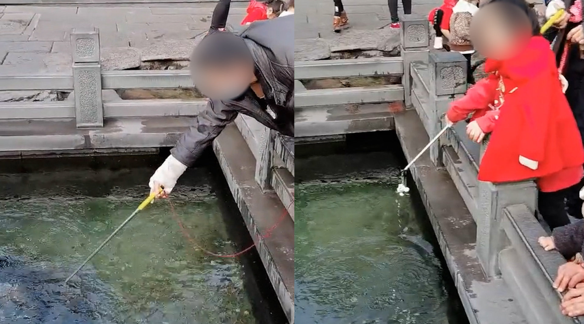 大爷自制工具在趵突泉吸硬币,游客:这种行为不好,他还带着孩子