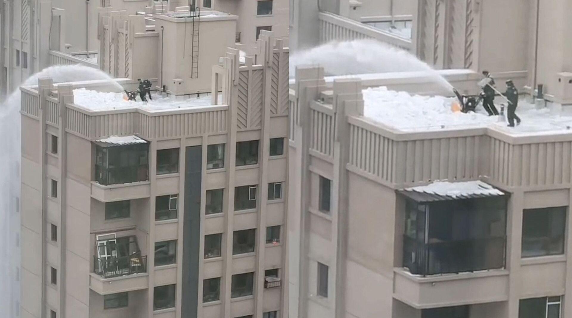 哈尔滨一小区楼顶硬核清雪看呆南方网友 网友调侃:局部地区暴雪
