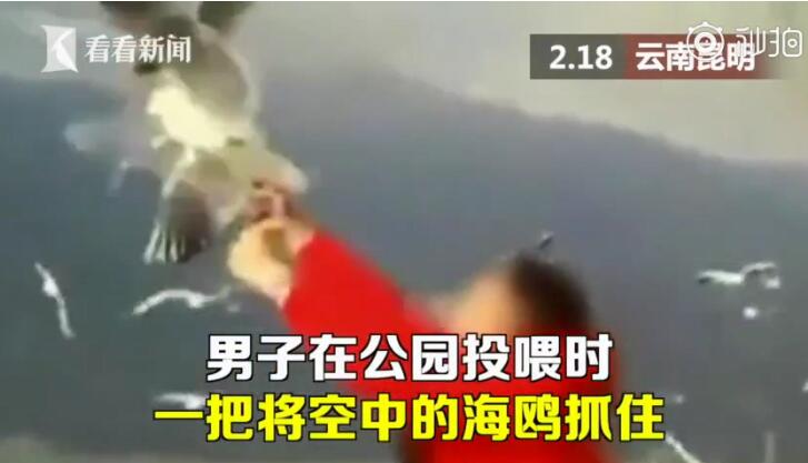 男子在公园投喂时一把拽住海鸥,还向同伴炫耀