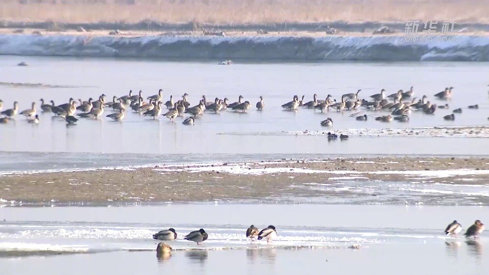 冬去春来、冰雪消融、飞鸟翔集 新疆阿克苏成千上万只水鸟在河面嬉戏