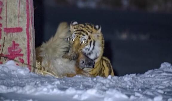 实拍野生东北虎猎食飞扑咬住护院大狗 摄影师和老虎仅有七八米