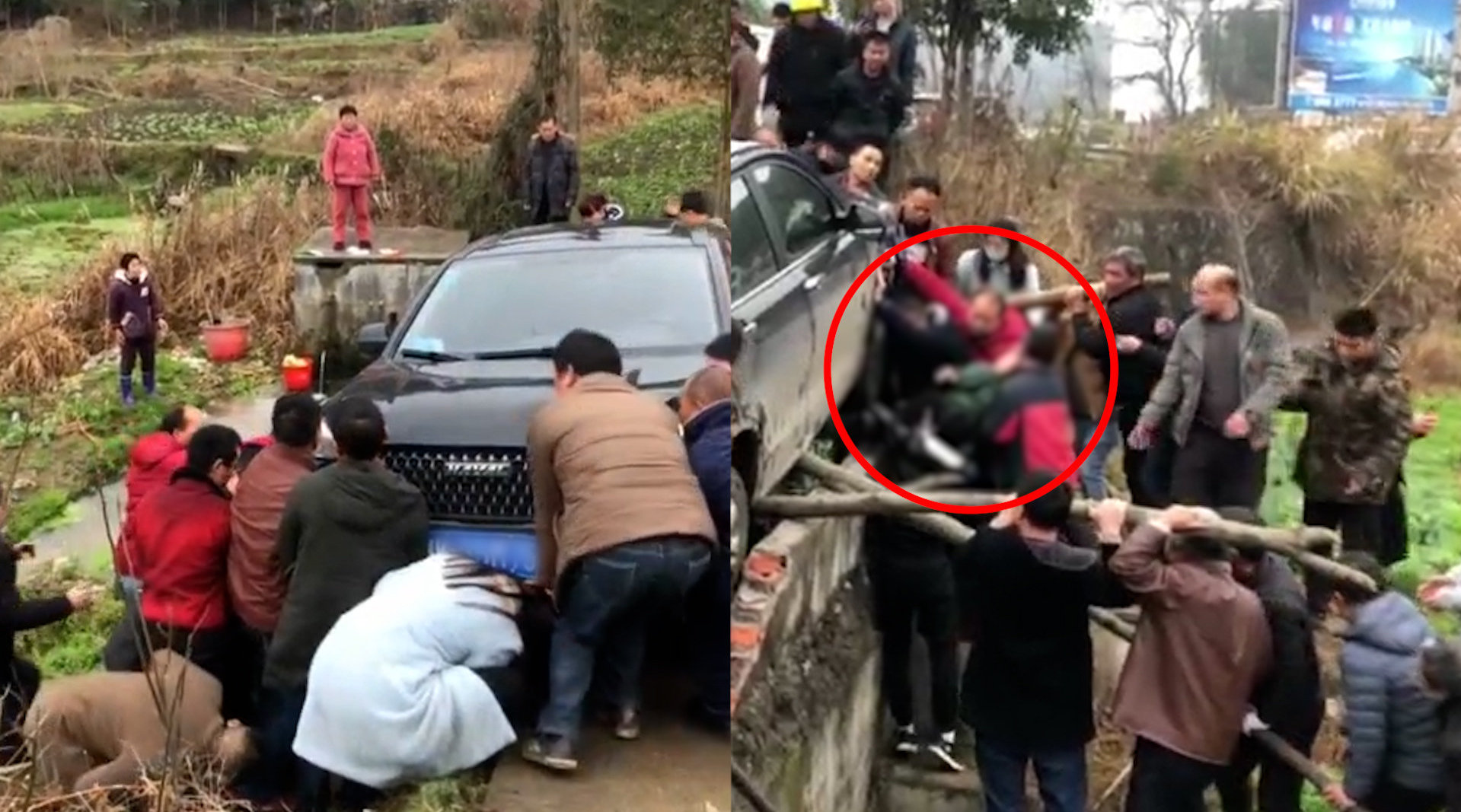 老人被压车底村民10分钟抬车救人 目击者:司机直接钻进车底救人