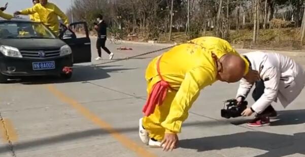 大爷用一只耳朵拉动3辆汽车 围观者目瞪口呆