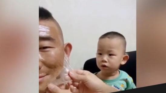 妈妈给爸爸揭面膜酷似“撕脸皮”看呆萌娃 表情害怕到扭曲