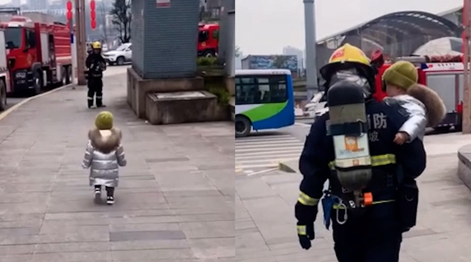 萌娃偶遇消防员爸爸没认出 被爸爸单手抱起背影暖哭