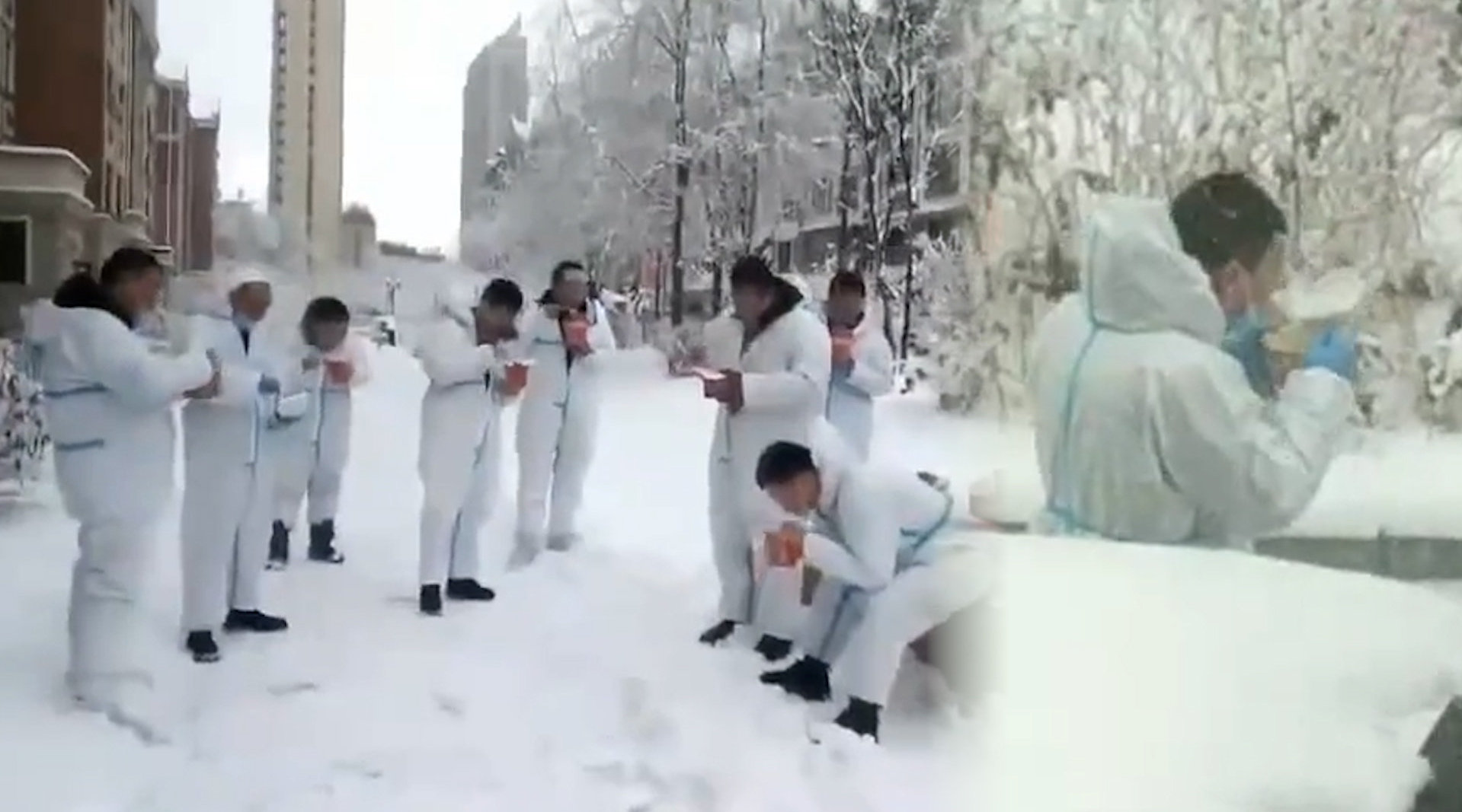 通化志愿者冒风雪在户外吃泡面 “大白”们有坐有站身影让人心疼