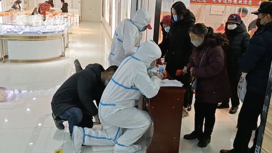 防疫志愿者跪地为顾客登记 他拿来一块泡沫板