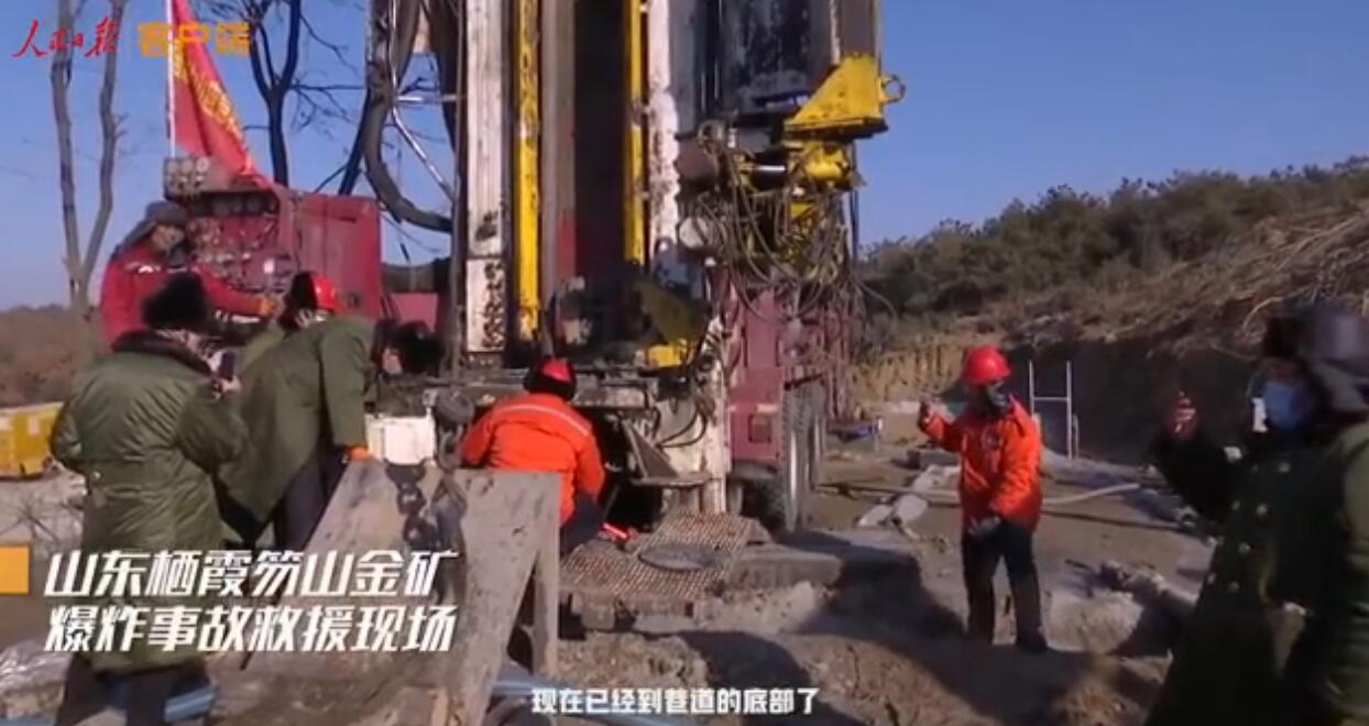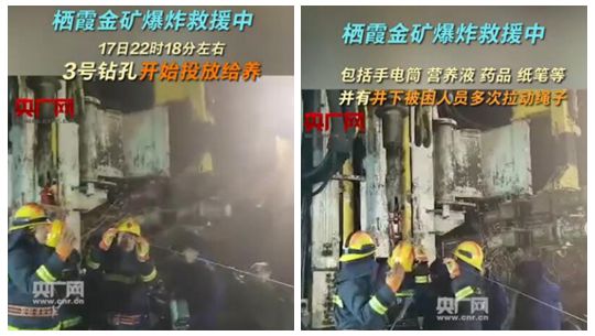 18日5时08分许,栖霞金矿事故现场又一处钻孔——1号钻孔打通