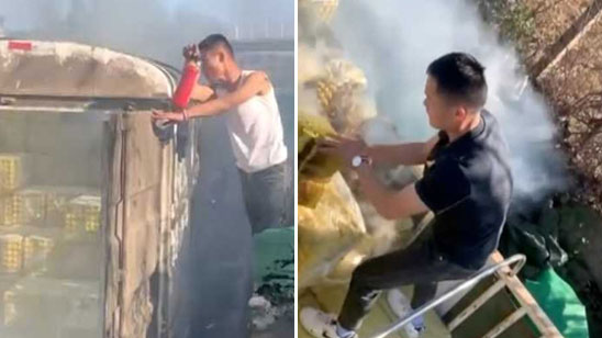 货车冒烟起火 两名出差消防员徒手上阵抢运货物