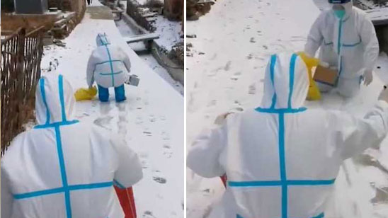 雪后路滑医护人员蹲地滑行 为隔离人员核酸采样