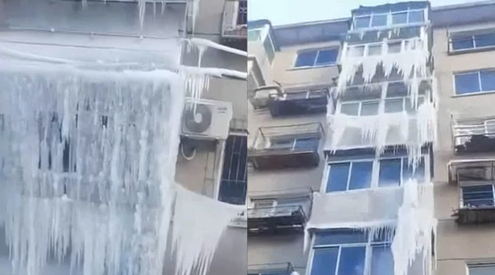 沈阳小区7楼漏水冻成冰瀑布 一夜冰封1楼阳台 居民拍下壮观一幕
