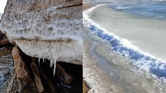 青岛海浪翻涌时瞬间结冰被冻住 市民:低温天气,接近零下17度
