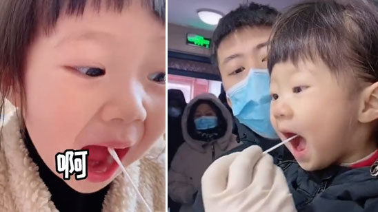 乖巧!妈妈在家给2岁女儿模拟核酸检测