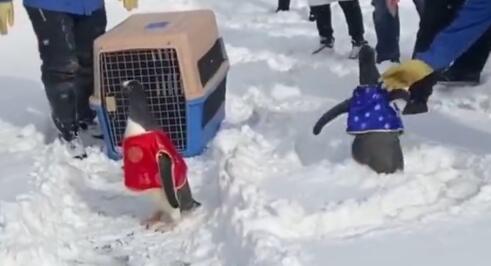 穿新衣服过年了 大连两只企鹅穿中式冬装视频逗笑网友