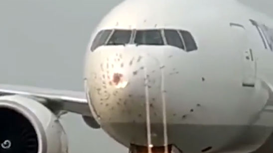 一架波音777起飞不久撞上鸟群 雷达罩布满鸟血被撞变形