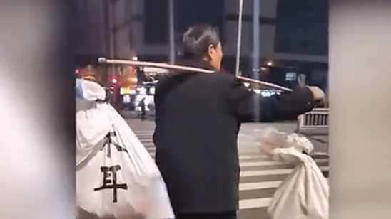 长春大爷一路扁担挑着两大袋特产 看望远在江苏的儿子