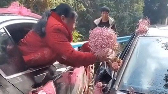两辆婚车公路“狭路相逢”不约而同停下 互换手捧花互送祝福