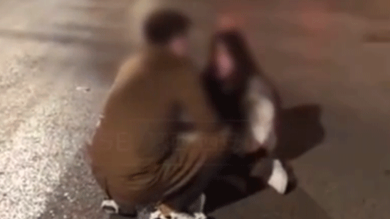 太危险!情侣蹲马路吵架 的哥帮挡车劝离