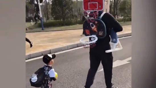 老爸自制溜娃神器把娃带成了投篮高手 网友:移动篮球场