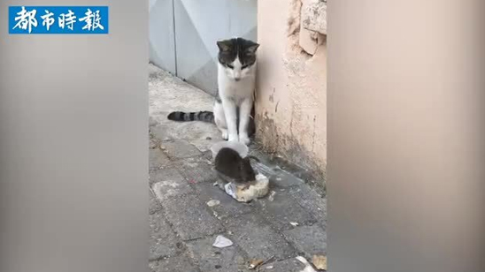 老鼠在猫面前淡定吃饭 网友:丢尽猫脸
