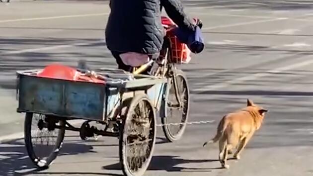 天津街头小狗卖力帮老人拉车 路人:希望老人好好对它